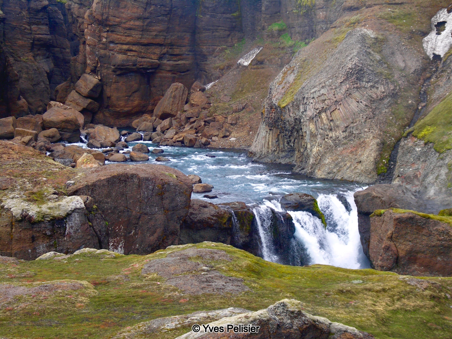 Continuing alongside the Djúpá river, the group reaches the impressive Bassi waterfall before climbing slopes and following a lengthy stretch of rapids. From this vantage point, the mighty Vatnajökull glacier and its outlet glacier, Síðujökull, come into view. The route leads through the hills of Gæsabringur—an area frequented by pink-footed geese in autumn—and concludes at the gorge of Langagil, where camp is set up. The day’s hike is 12 km, with a 300-metre ascent.